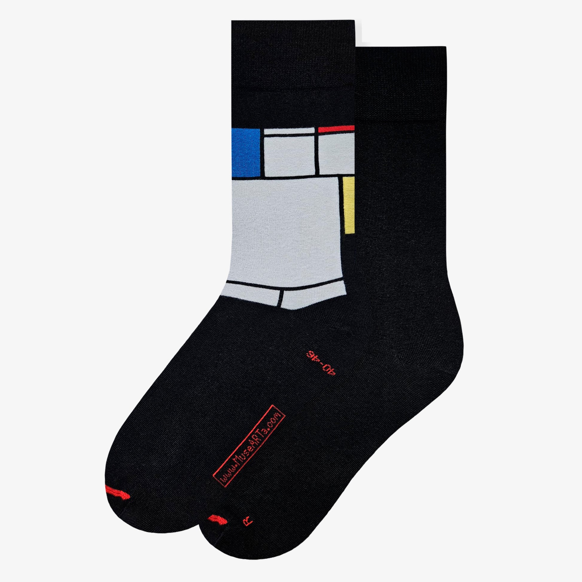 Immergiti nel mondo dell'arte moderna con questi squisiti calzini artistici che interpretano magistralmente l'iconica composizione di Piet Mondrian. Il caratteristico gioco di colori blu, rosso, giallo e nero sul classico bianco porta l'eleganza geometrica nella tua vita quotidiana. Perfetto per gli amanti dell'arte e gli appassionati di design che vogliono vivere la propria passione fin nei più piccoli dettagli. Questi calzini di alta qualità uniscono la raffinatezza artistica al comfort quotidiano: una dichiarazione sottile per gusti sofisticati.