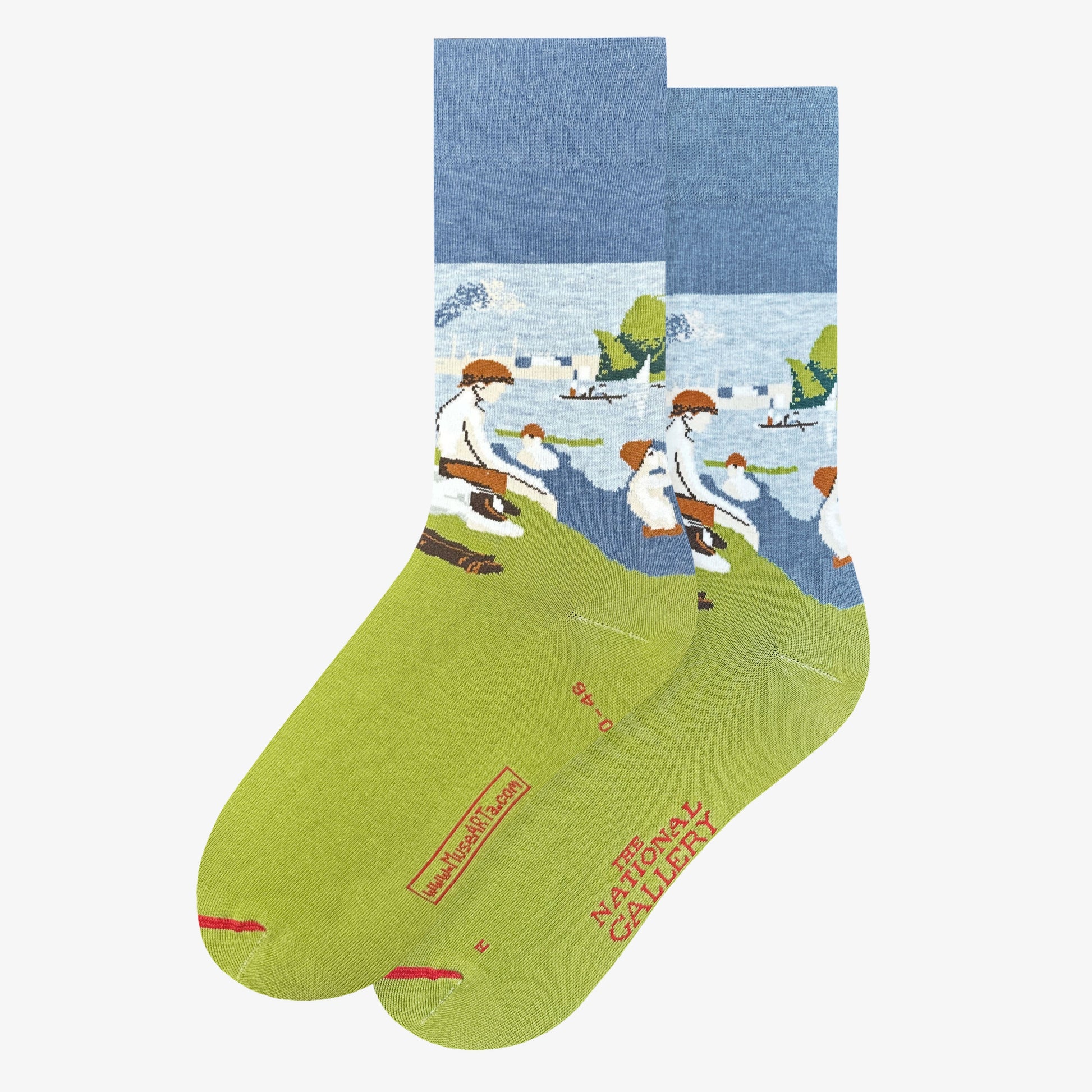 Zeitloses Sockendesign mit dem Kunstwerk "Badende in Asnières" von Georges Seurat.